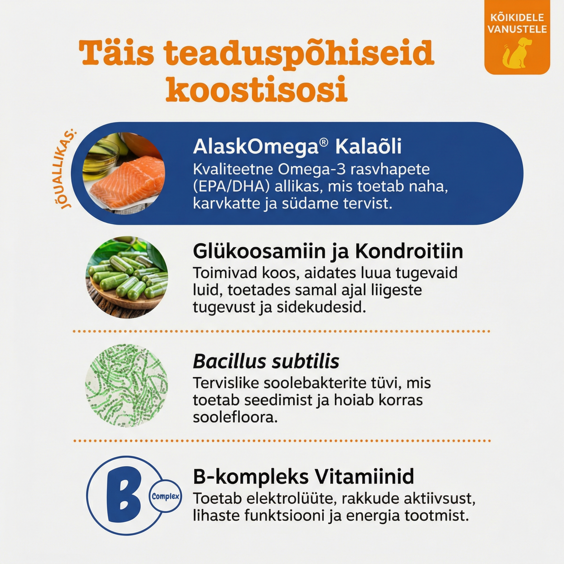 Oomega-3 rasvhapped, mis toetavad naha ja karvkatte tervist ning aitavad vähendada põletikku.
